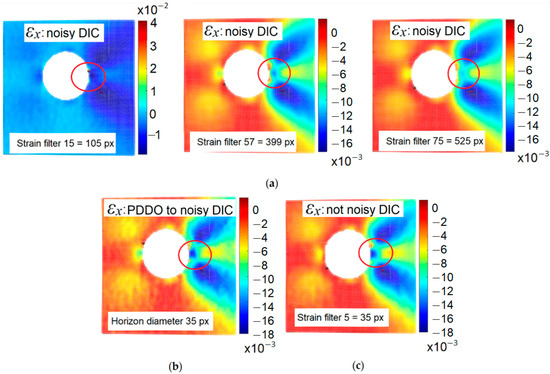 The DIC strain filter of size 15 does not effectively reduce the generated noise (Figure 15a left) resulting in almost 20 times higher maximum absolute strain value than the accurate DIC values in Figure 15c. Only by increasing the DIC strain filter size up to 57 or 75 reduces the generated noise, but the peak values of strains are lost (see red circle in Figure 15). On the contrary, the results obtained by applying the PDDO to the noisy DIC displacement data do not lose the peak values (Figure 15b). Thus, it can be concluded that the PDDO method applied to noisy DIC displacement data can filter the input noisy data and smoothen the results while not losing the strain resolution due to filtering as it is the case for the DIC strain filter. Based on this feature, the PDDO can be considered for implantation in DIC calculation software, as an alternative method to the ones currently existing in different DIC software for the DIC strain evaluation (e.g., based on displacement shape functions, strain shape functions, strain filters, etc.).