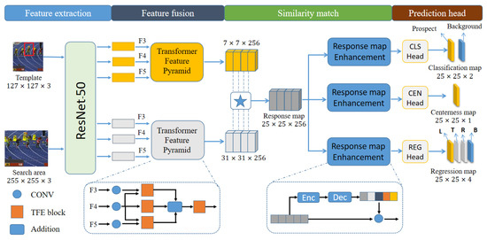 In view of the above, this paper proposes a target tracking algorithm with a response map enhancement module based on the Transformer feature pyramid (TR-Siam). As shown in Figure 1, the framework mainly consists of four simple sub-networks: feature extraction sub-network, feature fusion sub-network, similarity match sub-network and prediction head. The Transformer-based feature pyramid (TFN) is a key feature of the feature fusion sub-network. TFN can efficiently fuse shallow and deep features to achieve feature enhancement. In addition, the response map enhancement module is introduced into the similarity match sub-network to improve the algorithm’s foreground and background recognition abilities. Experiments show that the proposed TR-Siam has better robustness in dealing with complex scenes such as similar object, occlusion and viewpoint change. Our main contributions are: