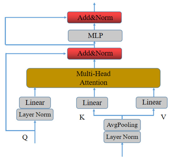 Based on the limitations of above methods, this paper adopts Transformer-based feature pyramid structure for feature fusion, establishes the connection of global context, and gives full play to the advantages of feature fusion. We modified the Transformer structure proposed in the literature [25]; specifically, we removed steps of position coding in the traditional Transformer and used zero-padding with its own location information for object tracking. This allowed us to obtain a lighter Transformer-based structure and better accomplish feature fusing. The module is shown in Figure 2.