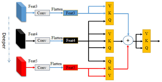 In this formula, where Q, K, V represent query, key and value; represents the number of channels, i.e., sequence length; N = 8 represents the number of attention heads; , , , represent the weight coefficient obtained by network training. This module calculates the similarity between Q and K, multiplies V by the normalized weight, and realizes the feature enhancement of V. As shown in Figure 3, multiple Transformer based feature enhancement modules are used to realize the feature fusion pyramid.