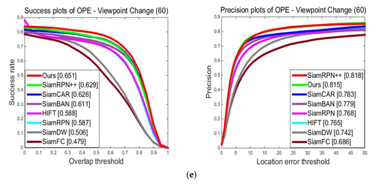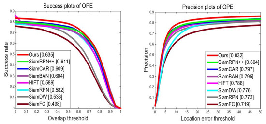 UAV123 contains 123 image sequences, which were collected by a low altitude unmanned aerial vehicle. This benchmark had obvious characteristics, including tiny targets, similar objects, occlusion and so on. Success and Precision plots were used to evaluate the performance of the trackers. Precision plots refer to the percentage of the number of frames whose CLE is less than 20 pixels in the total frames. The formulas are as follows.