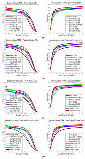 The performance of the five attributes is shown in Figure 6, demonstrating that our method obtained the best performance among the comparison methods. On the one hand, as for success rate, our method achieved better results, including Similar Object (0.579), Partial Occlusion (0.542), Full Occlusion (0.398), Aspect Ratio Change (0.595) and Viewpoint Change (0.651) On the other hand, as for the precision plot, we also attained better a performance in all challenges. Compared to the baseline tracker SiamCAR, our proposed method achieved significant performance gain in Similar Object and Partial Occlusion challenges with 5.4%, 3.9% in precision plot and 3.5%, 2.8% in success rate. In summary, the attribute-based evaluation proves our method can improve the performance when concerning similar object and occlusion.