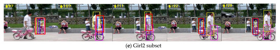 Girl2: As shown in Figure 8e, in the Girl2 video sequence, the difficulty of the video sequence is that the girl is occluded by similar object. When the target begins to be occluded by similar targets in 107 frames, all algorithms look for the target. When the target is completely occluded in frame 111, tracking drift appears in SiamRPN++. From 111 frames to 129 frames, similar objects keep moving far away from the girl, and a tracking failure occurs in the comparison algorithm. However, the algorithm in this paper can still track the target correctly after the target reappears. This shows that our proposed algorithm can effectively solve the problem of when the target is occluded by a similar object and ensure the robustness of the algorithm.