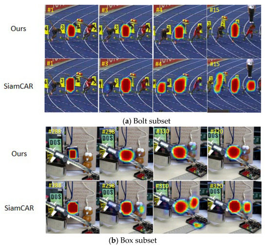 The Bolt sequence is a video sequence with similar object interference and occlusion. By comparing heat maps, it can be found that our method can clearly distinguish between target and similar object, while baseline tracking SiamCAR is greatly affected by similar object interference focus on multiple similar objects. In the Box sequence, the attention of the baseline tracker SiamCAR begins to drift and it starts to pay attention to other objects in the area when the target is blocked. Our proposed method is not affected by this and only focuses on the target. This shows that our method will not experience attention drift when disturbed by a similar object and become blocked.