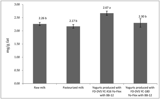 The conducted research has shown that the content of CLA in raw milk was 2.26 mg/g of fat. In pasteurized milk its content was slightly lower, reaching 2.17 mg/g of fat. In yogurts produced using FD-DVS YC-180 Yo-Flex with BB-12 containing Lactobacillus delbrueckii subsp. bulgaricus, Lactobacillus delbrueckii subsp. lactis, Streptococcus thermophiles, and Bifidobacterium bifidum, it was at a similar level to the one found in raw milk. A significantly (p < 0.05) higher content of this acid (2.67 mg/g fat) was found in yogurts produced using the FD-DVS YC-X16 Yo-Flex starter culture with BB-12, containing Lactobacillus delbrueckii subsp. bulgaricus, Streptococcus thermophiles, and Bifidobacterium bifidum (Figure 1). A study by Santos Junior et al. [32] indicated that raw milk had 14.91 mg/g of fat of cis9trans11 C18:2 acid, while pasteurized milk and yogurts were characterized by a significantly lower content of this acid, reaching 6.22 mg/g of fat and 5.41 mg/g of fat, respectively. According to Lin et.al. [80], the content of CLA in fermented milk drinks varied from 3.82 mg/g of fat in yogurts to 4.66 mg/g of fat in buttermilk. In non-fermented milk drinks, the content of CLA ranged from 3.38 mg/g of fat in condensed milk to 4.49 mg/g of fat in whole milk. Prandini et al. [75] stated that the mean CLA content in Italian fermented milk drinks produced with varied starter cultures ranged from 4.42 mg/g of fat in probiotic yogurts to 6.15 mg/g of fat in fermented milk from mountain pasture cows.