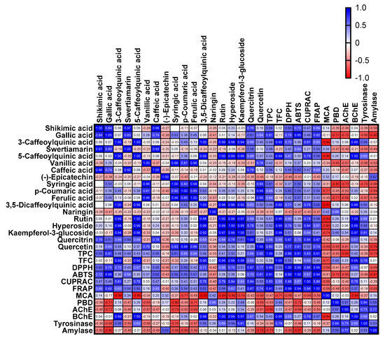 Correlation heat map between chemical components and biological activities of the tested extracts (p < 0.05).
