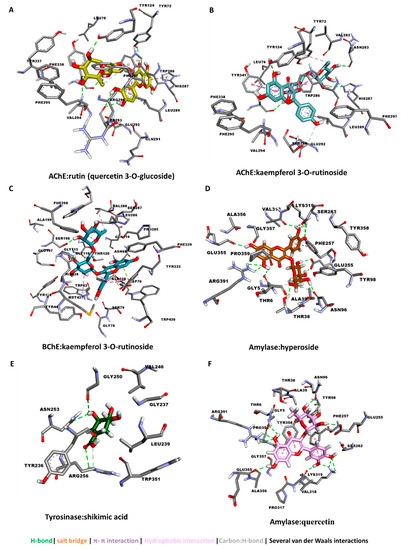 Protein–ligand interaction: (A) AChE and rutin (quercetin 3-O-glucoside), (B) AChE and kaempferol 3-O-glucoside, (C) BChE and kaempferol-3-O-glucoside, (D) amylase and hyperoside, (E) tyrosinase and shikimic acid, and (F) amylase and quercetin.