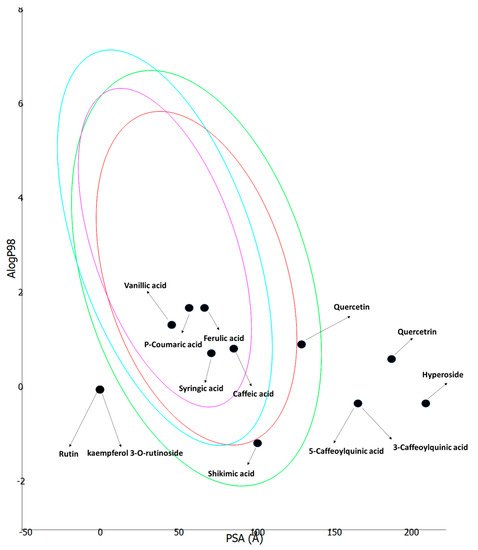 ADMET plot: logarithm of octanol–water partition coefficient (LogP) versus topological polar surface area (PA), The 4 ellipses define areas of well-absorbed molecules: 95 and 99% of a molecule are expected to be in ellipses colored in red and green, respectively, and 95 and 99% of a molecule are within the ellipses colored in magenta and aqua, respectively, for blood–brain barrier permeability.