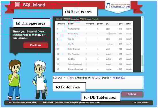 - Simple Graphical User Interface (GUI). SQL Island consists of the following areas presented in Figure 1: (a) the graphical dialogue area where the dialogue of the player with other inhabitants of the island is depicted; (b) the results area where the outcomes of SQL statements, either provided by the game as examples or written by the player in response to the challenges described, are presented; (c) the editor area where the player writes SQL statements; (d) the database tables area where the tables of the database are presented.