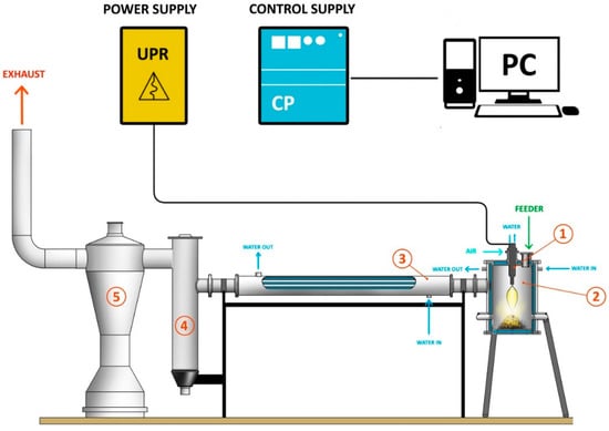 Figure 1. Plasma system for fly ash processing. 1. Plasma torch, 2. Furnace, 3. Heat exchanger, 4. Filter bag, 5. Scrubber.