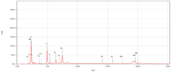 Figure 2 depicts the chemical composition of the waste before the treatment measured by XRF analysis. This figure shows that Ni, Fe, S, V, Ca, P, Sr and Mo are the waste’s major constituents. The concentrations of elements present in the wastes were measured using ICP-AES, and were presented in Table 2. The elements with very low concentration are not listed in Table 2. The elements such as, Ni, V, Fe, Mg, Ca, Na, and Al represent the major constituents of wastes (100–1000 mg/kg), whereas the minor constituents (1–100 mg/kg) include Mo, Ba, Zn, Cr, Ti, Pb, and Mn. Toxic elements such as Cd and Sr, are present in the wastes but with relatively low concentrations. These results confirm the XRF analysis (Figure 2).