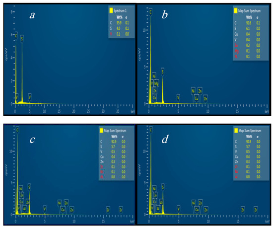 After each cycle, the treated waste was analyzed with XRF, ICP, and EDX. Figure 3 predicts the principal elements remaining in the waste after each cycle of treatment. These Figures show that the waste kept these main constituents (NiO, Fe2O3, SO3, V2O5, CaO, P2O5, SrO and MoO3). EDX analysis, presented in Figure 3b–d, shows a reduction in the percentage of carbon in the waste, but the carbon remains the major constituent of the waste. Table 3 and Table 4 give the concentrations of major and minor elements present in the waste after each cycle of treatment. The waste kept the same major and minor elements before and after treatment. The concentrations of major and minor elements were increased after each cycle of treatment. These results can be explained by the decreases of the concentration of carbon in the waste due to the combustion of carbon during the treatment.