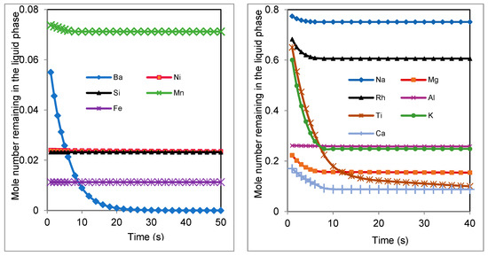 Figure 4 shows that the masses of elements decrease after each cycle of treatment. This diminution can be attributed to the vaporization of these elements under the high temperature of the plasma. These results were confirmed by the model calculation (Figure 5). This figure shows that the vaporization speed and the vaporized quantity are important for many elements, such as Ba, K, and Ti. Other elements like Mg, Rh, and Ca, are vaporized in the first 10 s, and after this time they are stable. This effect is due the combustion of carbon in the first 10 s. Elements like Fe, Ni, Si, and Al are not volatile and their mole numbers remains constant. These results are logical because the vaporization temperatures of these elements are very high. In contrast, the experimental results show a decrease in the quantities of Fe, Ni, and Al, after each cycle of treatment. This difference between the experimental measurements and the code results is due to the loss of waste in the components of the plasma system (furnace and exchanger) during the treatment, and because the initial used masses of these elements are very low (2.4 g for Ni, 2.01 g for Fe, and 0.135 g for Al).