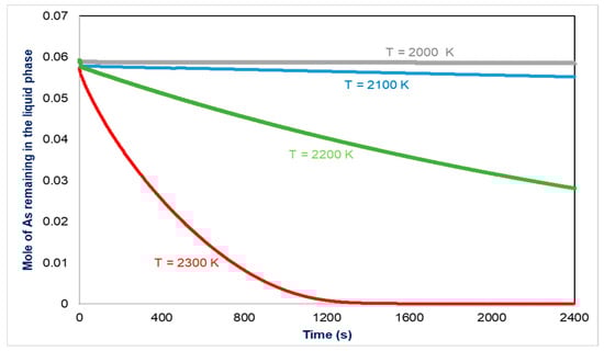 The influence of the bath surface temperature on the arsenic volatility was presented in Figure 7. This figure shows that arsenic is not volatile for temperatures less than 2000 K, whereas for temperatures beyond 2100 K, the vaporization speed increases and the arsenic quantity that leaves the furnace becomes important. These results can be explained by the stability of the arsenic components with temperature. In fact, any increase in temperature in this range leads to the stability of arsenic gas species due to the decrease in their formation free enthalpies.