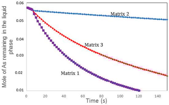 To study the influence of matrix composition on the volatility of As, three matrices were used. Matrix 3 represents the initial composition of waste and is given by Table 2. Matrix 1 and 2 have the same composition to matrix 1, but in matrix 1 the mole number of Ba was reduced to 0.01 mole, whereas in matrix 2 the mole number of Ba was increased to 0.5 mole. Figure 9 depicts the influence of the composition of the containment matrix on the arsenic volatility. The increase of the quantity of Ba in the containment matrix strengthens the confinement of As in the matrix. In fact, the addition of the mole number of Ba in the confinement matrix led to the increase of the mole numbers of Ba3(AsO4)2 in the liquid phase. This molecule, which has a significant quantity (between 10−3 mol and 10−2 mol), is responsible for the confinement of As in the matrix.
