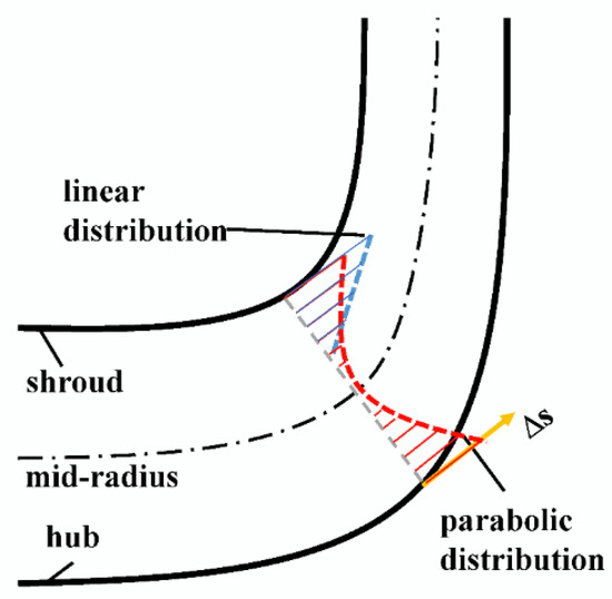 Both the linear and parabolic distribution forms along the span are depicted in Figure 1. The values that have to be manually entered in these distributions, such as the spanwise location and value of the minimum vaneless loss with a parabolic distribution, are specified with the view that they can represent some basic features of the meridional field of a compressor. In this way, the throughflow solver can be adopted as an independent analysis tool in the preliminary design stage with moderate accuracy in terms of meridional flow field prediction. The accuracy of these distributions can be further improved by the results from the 3D viscous computations and experimental measurements.