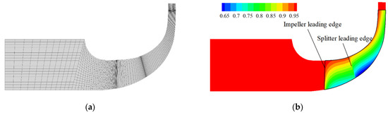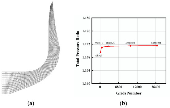 The LSCC is a low-speed centrifugal compressor with a semi-open and backswept impeller that was designed by the NASA Lewis research center, and it has a design performance of 30 kg/s in the mass flow rate and 1.166 in terms of the total pressure ratio. As a validation for the developed throughflow method, the numerical simulation of the LSCC case is compared with the experimental data by Hathaway et al. [54]. The computations were performed on a 365 × 40 grid, which is sufficient for the Euler-based time-marching throughflow computation, as can be seen in the grid-independence validation shown in Figure 2b. For clarity, a coarser grid is depicted in Figure 2a instead of the actual grid.