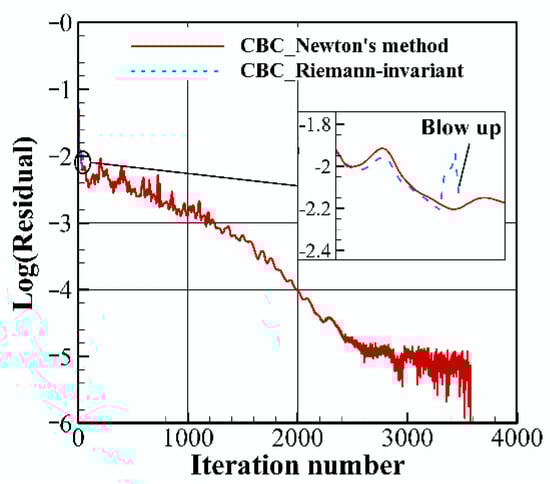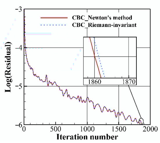 which is exactly the same as the subsonic outlet BC correlations shown in [52]. Therefore, the CBCs based on Newton’s method developed in this study actually change the inlet boundary treatment for the throughflow simulation. It calculates the variations of the flow parameters at the inlet boundary, rather than directly calculating their absolute values as conducted in the Riemann-invariant-based method, which is considered to be more robust. Velocities both at the inlet and outlet boundaries can be computed as