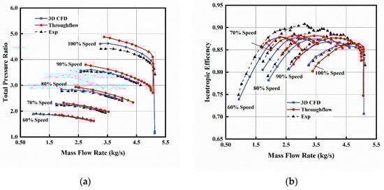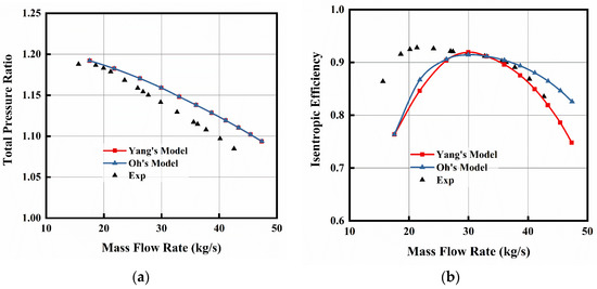 A further investigation of the off-design performance of the LSCC was implemented. It was reported by Oh et al. [40] that the recirculation flow model has a great influence on the off-design predictions. Therefore, both the recirculation loss models developed by Oh et al. [40] and Yang et al. [48] were validated in this case. Figure 4 shows the comparison between different settings of the recirculation loss model in terms of both the total pressure ratio and the isentropic efficiency. In Figure 4a, it seems that the recirculation loss has little effect on the total pressure ratio. This is reasonable because as one kind of parasitic loss, the recirculation loss only leads to a change in enthalpy and a corresponding change in efficiency. It can also be seen that the discrepancy between the throughflow results and the experimental data increased with the mass flow rate. Nonetheless, the maximum error was less than 2.5% within all operating ranges. Unlike the total pressure ratio, the off-design performance of the isentropic efficiency was greatly influenced by the recirculation loss model setting, as shown in Figure 4b. When the mass flow rate was larger than the design value, Yang’s recirculation model was in good agreement with the experiment, whereas it seems that no significant loss was produced by Oh’s model and thus resulted in higher isentropic efficiency. For the small mass flow rate, both Yang’s and Oh’s models showed dramatically increased discrepancy compared to the experiment as the mass flow rate decreased. Nevertheless, the trend of the rapid efficiency decrement was predicted by both models. The comparison shown in Figure 4b indicates that a more accurate recirculation flow loss model needs to be developed. Table 3 further reports the detailed contributions of each loss to the total loss in the throughflow simulation at different operating conditions when Yang’s recirculation model was adopted.