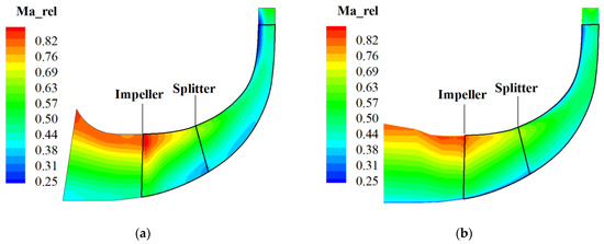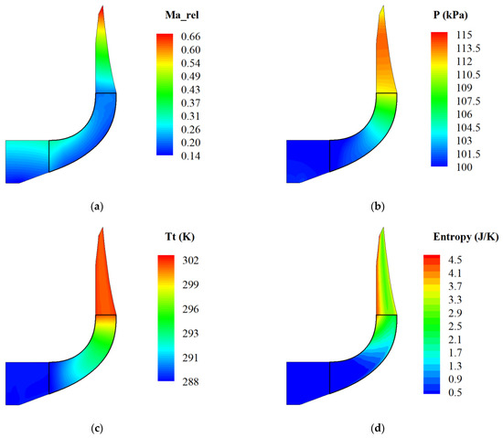 Meridional flow field of the LSCC at design mass flow rate: (a) Relative Mach number; (b) Static pressure; (c) Total temperature; (d) Entropy.