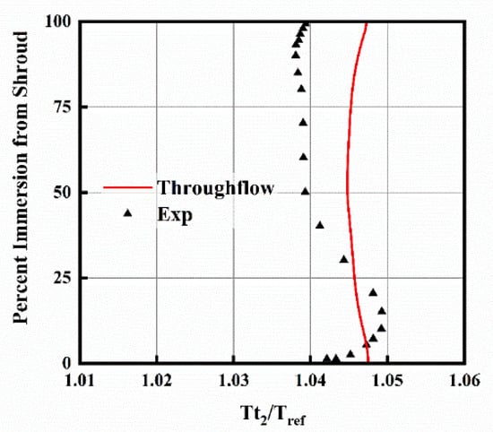 The spanwise distribution of the flow parameters at the impeller outlet is always the key point that the designers are concerned with. Therefore, a comparison of the spanwise distribution of total temperature ratio at the design point between the throughflow results and experimental data was implemented and is shown in Figure 6. It can be seen that, except for the nearby shroud region, the calculated total temperature ratio was slightly lower than the experiment below the 25% spanwise location. At the other positions, the calculated results remained higher than the experimental values. This accounts for the higher total pressure prediction at the design point discussed above, as the isentropic efficiency was accurately predicted. Moreover, it can also be observed that the experimental distribution of the total temperature ratio had a distinct change below 40% spanwise. As a comparison, the throughflow result had a nearly flat distribution curve. This was mainly due to a uniformly distributed slip factor along the whole blade span in the throughflow simulation in this study. A more realistic distributing method of the slip factor suiting the throughflow calculation is still expected.