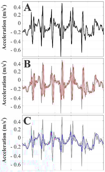 Figure 1 presents the raw and filtered data of a healthy male volunteer performing a timed up-and-go test (i.e., commonly used to assess the risk of falls in the elderly population). The accelerometry data were recorded using a triaxial sensor (MetaMotionCTM, MBIENTLAB-INC) attached to the volunteer’s lumbar region. In this image, the raw data (A), the Butterworth filter (B), and the Kalman filter (C) are displayed.