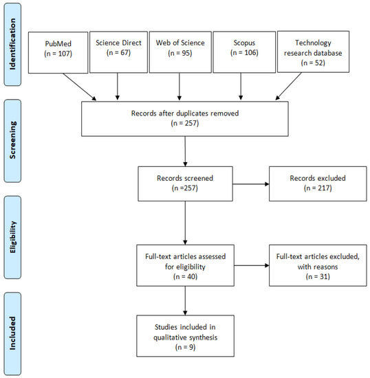 Searching the descriptors, a total of 427 articles were identified (PubMed = 107; ScienceDirect = 67; Scopus = 106; Web of Science = 95; Technology Research Database = 52). After applying the inclusion criteria and removing duplicates, nine studies were eligible for this review (Figure 2). These articles are described in Table 1.