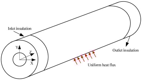 The flow and heat transfer process of hydrocarbon fuel in a horizontal circular tube at supercritical pressure was studied. Figure 3 shows the schematic diagram of the cooling channel. The inner diameter of the cooling channel was set as 1 mm, the outer diameter was set as 3 mm, and the length of the cooling channel was 1000 mm. The tube was heated by a uniform heat flux. To ensure the full development of the flow, an insulation section in the inlet was set with a length of 100 mm. To reduce the influence of the outlet and ensure the fluid mixed evenly, an outlet insulation section with a length of 100 mm was developed.