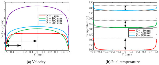 Based on the above calculation method, the flow and heat transfer characteristics of n-decane were studied under the conditions of an inlet fuel temperature of 300 K, an inlet fuel mass flow of 1 g/s, a heat flux of 0.15 MW/m2, and an outlet pressure of 5 MPa. The fuel was heated from room temperature to supercritical temperature, which covered the subcritical and transcritical temperature region. The velocity and temperature distributions of different cross sections are provided in Figure 4. As seen in Figure 4a, due to the influence of the fluid viscosity, the velocity distribution in the heated section was a parabola. Furthermore, in the near wall section, the velocity gradient was larger than in other parts. At the inlet of the insulation section, most of the layer of the fluid velocity was about 2 m/s, due to the insufficient development of a velocity boundary layer. As seen in Figure 4b, the fuel temperature was distributed symmetrically along the Y axis. At the same cross section, the fluid on the adjacent wall was heated first, while the axial fluid remained unheated, which resulted in a stratification of the temperature. The thickness of the thermal boundary layer was the largest near the inlet of the heated section; then, it decreased along the channel.