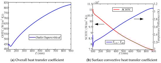 The unmodified overall heat transfer coefficient s calculated by the average temperature difference of the cross section, while the modified overall heat transfer coefficient is calculated by the flow state. As seen in Figure 4b, in the outlet of the cooling channel, the fuel temperature on the adjacent wall was in the supercritical temperature region, while the axis fuel temperature was in the transcritical or subcritical temperature region. The overall heat transfer coefficient calculated by Equation (4) not only considered the influence of the temperature on the thermophysical property of the fuel but also considered the influence of the flow state on the fuel heat convection.