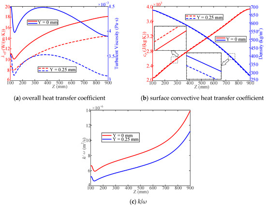 From Equation (6), with the constant turbulent Prandtl number, the turbulent thermal conductivity increased with the increase in the constant-pressure specific heat capacity and turbulent viscosity. As seen in Figure 6a, before Z = 400 mm, the trend of the effective thermal conductivity was consistent with that of the turbulent viscosity. However, after Z = 400 mm, the effective thermal conductivity kept increasing despite the decrease in the turbulent viscosity. Such a trend is attributable to the increase in the constant-pressure specific heat capacity, which was larger than the decrease in the turbulent viscosity near the pseudo-critical temperature region (Figure 6b). The trend of the turbulent viscosity can be explained by the trends of the density, kinetic turbulent energy, and the specific dissipation rate. As seen in Figure 6c, after Z = 600 mm, k/ω exhibited a greater upward trend. As seen in Figure 6b, the density showed a downward trend, which was greater than the increase in k/ω near the pseudo-critical temperature region. As a result, the turbulent viscosity showed a downward trend after Z = 600 mm.