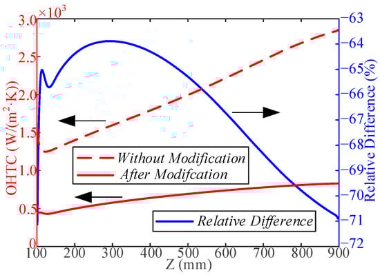 As seen in Figure 7, the unmodified overall heat transfer coefficient showed a trend of decreasing at first and then increasing. The relative difference between them was high in general, and it appeared at its maximum point near the inlet and outlet of the heated section, with a maximum value about −71%.