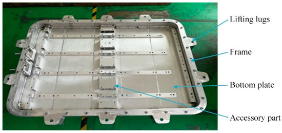 The power battery enclosure is made of aluminum alloy by welding. It is mainly composed of the bottom plate, frame, lifting lugs, and other accessories, as shown in Figure 1. After fixing the bottom plate and the frame through spot welding, MIG welding is carried out to make the frame and the bottom plate become a whole.