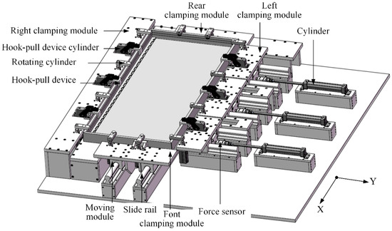 In order to meet the requirements on clamping, a rotating clamping cylinder and a clamping module driven by cylinder was adopted to realize the clamping in Z and X direction respectively. In Y direction, cylinders were used to drive the hook-pull devices on clamping modules of the crossbeams to move reversely, forming a reverse hook tension to realize the clamping effect. After the enclosure was clamped, the output clamping force of the driving cylinder can be dynamically adjusted according to the welding deformation force, so as to counteract the welding force to effectively restrain the welding deformation without damaging the workpiece.
