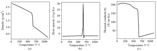 Thermophysical property parameters of 6005A aluminum alloy material: (a) the density of 6005A aluminum alloy change curve with temperature; (b) the heat capacity of 6005A aluminum alloy change curve with temperature; (c) the thermal conductivity of 6005A aluminum alloy change curve with temperature.