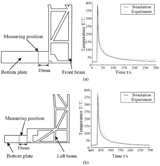 Thermal cycle curve of short-side weld and long-side weld of power battery enclosure: (a) the short side weld and the welding temperature curves of simulation and experiment; (b) the long side weld and the welding temperature curves of simulation and experiment.