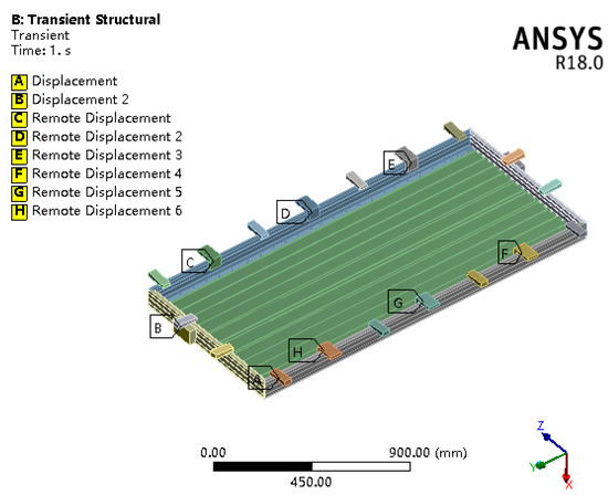 In order to obtain the welding deformation force curve, the constraint mode at the clamping position of the crossbeams on both sides of the power battery enclosure was set as the distal displacement constraint, and the displacement in the deformation direction of the crossbeams on both sides of the power battery enclosure was limited, as shown in Figure 6.