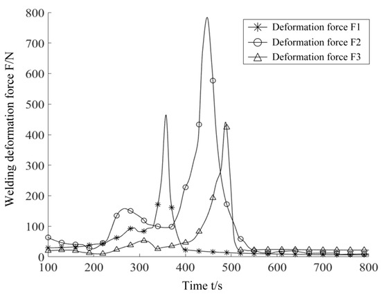 The main reason for the change of welding deformation force is the movement of welding heat source. The welding heat source approaches the constraint position, resulting in the gradual increase of deformation force, which reaches the maximum value at the constraint position. When the welding heat source approaches the constraint position, deformation force gradually increases and reaches the maximum value at the constraint position. Then, the deformation force decreases with the distance of the welding heat source gradually increasing. Since the restrain positions are evenly distributed on the crossbeams on both sides, the peak values of the deformation force F1 and F3 at the restrain positions at both ends are similar and less than the deformation force F2 at the middle restrain position. It is consistent with the result that the deformation of the crossbeam near both ends is small, and the deformation of the middle part is large in actual production.