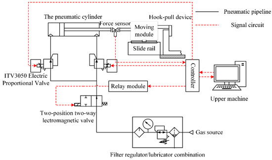 In order to restrain welding deformation, it is necessary to control clamping force of the hook-and-pull device. Therefore, ITV3050 electric proportional valve was adopted to build a clamping force servo control system, as shown in Figure 8. In the control system, the actuator is a single rod double acting cylinder, and the measuring element is a force sensor. The control system adjusts the pressure of the rod cavity and rodless cavity of the driving cylinder respectively through two electric proportional valves to accurately adjust the clamping force of the hook-and-pull device. Since the pneumatic servo system is a nonlinear time-varying system, the fuzzy adaptive PID control algorithm was applied to accurately and stably adjust clamping force of the crossbeam on both sides during the welding process.