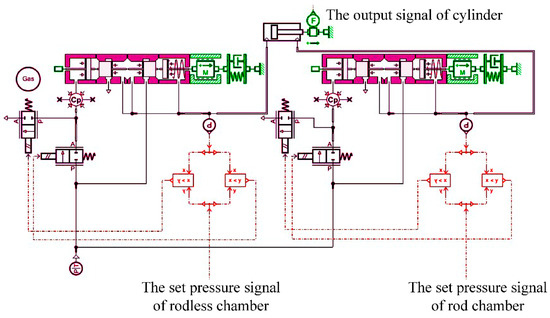 In order to verify feasibility of the pneumatic servo control system, an AMESim simulation model of the control system was established according to the working principle of the pneumatic servo control system, as shown in Figure 9. The AMESim simulation model consists of two electric proportional valve models and a single rod double acting cylinder model. In the simulation model, the pressure of the rod and the rodless cavity is controlled by two electric proportional valves. Output force of the cylinder was taken as the feedback signal. Simulation parameters of electric proportional valve are shown in Table 2.