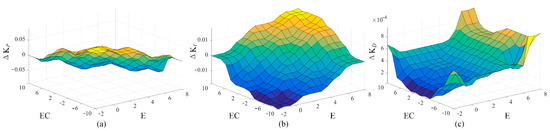 Defuzzification surfaces under different inputs: (a) the defuzzification surfaces of ΔKP under different inputs; (b) the defuzzification surfaces of ΔKI under different inputs; (c) the defuzzification surfaces of ΔKD under different inputs.