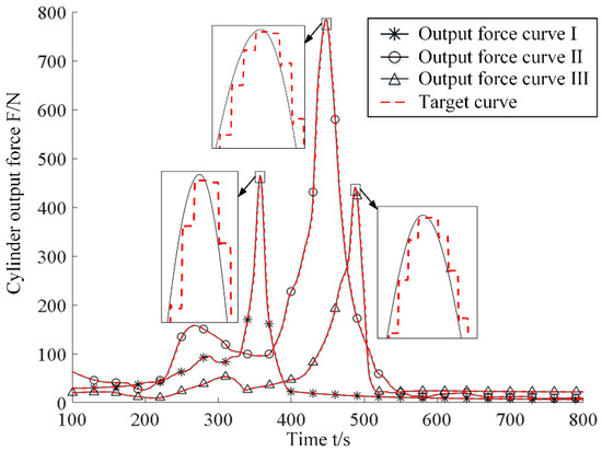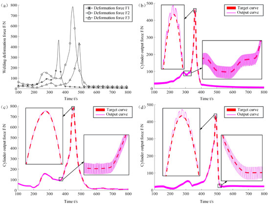 Based on the co-simulation model, the clamping force dynamic servo control system was simulated, and the welding deformation force was taken as the target curve signal. The cylinder output forces at three constraint positions obtained through the joint simulation are shown in Figure 12. The simulation results show that the control algorithm adopted in this paper can realize dynamic adjustment function of the output signal following the target curve and owns fast response speed and good following performance. Therefore, the established servo control system can dynamically adjust the output force of the cylinder by following the MIG welding deformation force.