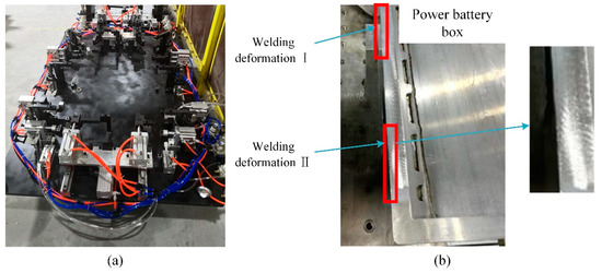 In order to verify the correctness of the MIG welding clamping scheme of the power battery enclosure proposed in this paper, the MIG welding clamp for the bottom plate and frame of the power battery enclosure was manufactured as shown in Figure 15a. The welding experiment was carried out on the clamp, and the experimental welding deformation results are shown in Figure 15b. It can be found that there are two areas with large residual deformation after welding. After measurement, the residual deformation I after welding shrinks inward by 0.3 mm, and the residual deformation II after welding shrinks inward by 0.6 mm, both of which are less than 1.2 mm specified in the requirements. Thus, the correctness of this scheme was verified.