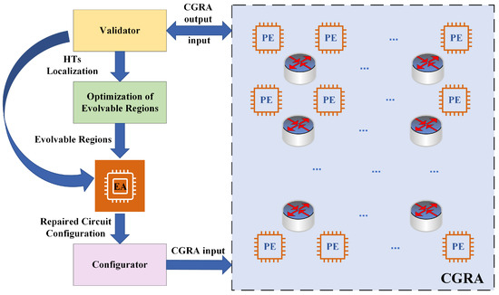 Figure 3 shows our proposed architecture for protecting CGRA from HTs attacks using circuit evolution. There are two important parts: the optimization of the evolvable region and the evolution algorithm. The number of PEs is chosen according to the functionality of the circuit implementation. If the circuit is complex and/or large, the EA module will evolve over a large number of PEs, so the evolution process can be very time-consuming. In order to improve the evolution efficiency, we optimize the evolvable region based on the original circuit structure. The evolutionary algorithm is the core of the entire circuit evolution process, which traverses the optimal circuit structure based on the evolvable input regions and the evolutionary goals of the circuit, and must also satisfy the corresponding constraints. In addition, we use a validator to input test vectors in the offline stage to check the function of the PE in CGRA to determine whether the PE is infected by the HTs and input the location information of HTs to the module of optimization of the evolvable region and EA. After the EA module evolves to obtain the optimal circuit structure, a configurator is used to load the circuit configuration file onto the CGRA to reconfigure the PE to protect the circuit from HTs attacks.
