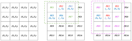 Algorithm 1 describes the pseudo-code for optimizing the evolvable region. The algorithm’s input is all PEs on the CGRA architecture, and the output is the optimized evolvable region. First, we assign coordinate values to the positions of all PEs with the purpose of quantifying the distance and area (lines 2–4). Based on this, we traverse to find the coordinates of the leftmost, topmost, rightmost and bottommost (, , , ) PEs of the current circuit to be evolved (lines 6–8). Once these four coordinates are obtained, the area of the rectangle in which the circuit to be evolved is located is calculated (line 10). If the number of free PEs () contained in this rectangular area is greater than the number of PEs inserted by the HTs (), then this area is the evolvable area. Otherwise, the clustering solves for the center coordinates () of the circuit to be evolved (line 17). Afterward, an attempt is made to expand the original region with rectangular cells (line 19) and calculate the Euclidean distance (lines 21–23) of all the newly added PEs from the CP. After that, the Euclidean distances are sorted in ascending order (line 25), and the relationship between the number of and the number of in the current region is compared in order (lines 27–29). If there are joined rectangular regions in which is greater than , the current region is an evolvable region; otherwise, lines 18–31 are repeated until the PE requirement for evolution is satisfied. The time complexity of this algorithm is O(n).