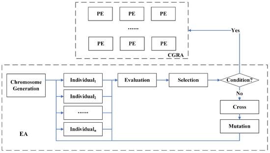 The overall implementation of the evolutionary algorithm is shown in Figure 5. We use external evolution to search for the optimal circuit structure and deploy the optimal circuit structure that satisfies the conditions to CGRA for implementation. We use one-dimensional genetic coding to characterize individuals, where the coding length is related to the specific circuit structure, reflecting the mapping of each function in the circuit to the PE. At first, we generate an initial population, where each individual in the population represents a circuit structure, and then set up an evaluation function to evaluate the individuals to further select the best ones for subsequent evolution. For traversing the optimization space, we employ crossover and mutation to generate new (better) individuals.