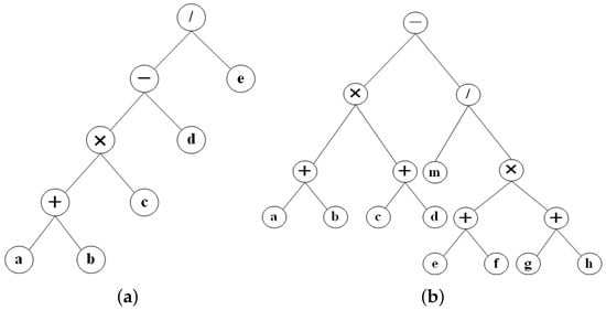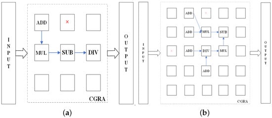 Example circuit-I performs ((a + b) × c − d)/e arithmetic operations, occupying four PEs, and is deployed on a CGRA with a total of nine PEs. Example circuit-II performs (a)(a + b) × (c + d) − m/(e + f) × (g + h) arithmetic operations, occupies nine PEs, and is deployed on a CGRA with 25 PEs. The data flow diagrams (DFG) of the two circuits are shown in Figure 6.