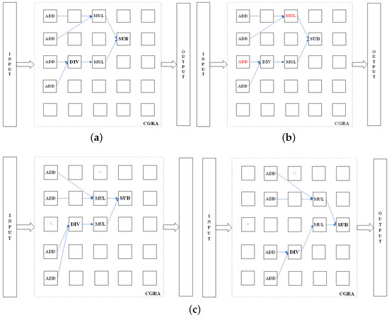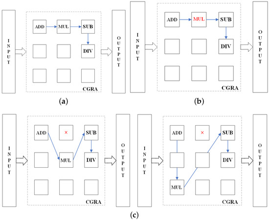 Examples of circuits infected by HT and corrected by CGRA reconfiguration are shown in Figure 7 and Figure 8, where the blue arrows represent the data flow. Figure 7a and Figure 8a show the initial version of the circuit, and Figure 7b and Figure 8b show the infected version of the circuit with one PE infected with HT in circuit-I and two PEs infected with HT in circuit-II. After performing the EA and reconfiguring the CGRA, the expected circuit function is corrected as shown in Figure 7c,d and Figure 8c,d.