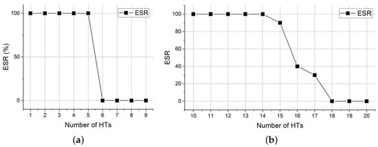 Figure 10 shows the effect of the insertion of different numbers of HTs in the CGRA on the ESR. Circuit-I requires four PEs to achieve the function and it evolves on a CGRA with nine PEs. In Figure 9a, it can be seen that circuit-I evolves successfully as long as there are more than four available PEs in the CGRA. Circuit-II requires eight PEs to achieve functionality and it evolves on a CGRA with 25 PEs. The range of the number of insertion HTs at this point is 1–25. Since the ESR is 100% for all insertions less than 10 and 0 for all insertions greater than 20, only this representative part is shown in Figure 9b to illustrate the variety of ESR with the number of insertion HTs. When the number of insertion HTs reaches 15, there are only 10 PEs available in CGRA. At this time, the ESR cannot reach 100%. When the number of insertion HTs reaches 16,17, it is more difficult to find a qualified circuit structure among the available PEs, so the ESR drops significantly. The reason for this is that circuit-II requires eight PEs to achieve the function, and the circuit combinations are more diverse, making it difficult to obtain a feasible solution in the limited number of PEs.