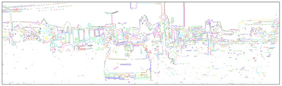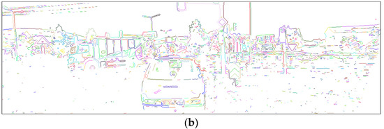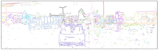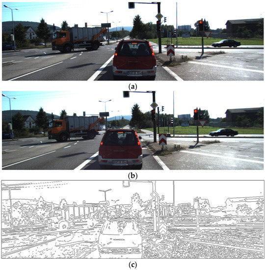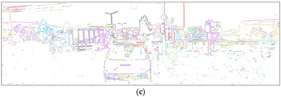 Figure 2a,b is an image pair (Test image 1) obtained from the KITTI database [34]. Figure 2a is the compared image (left image IL) and Figure 2b is the processing image (right image IR). The edge image detected by TCEDA is shown in Figure 2c. TCEDA can detect more edge information than other edge detection methods. However, some edge contours where image contrast is not clear may be detected incompletely, resulting in the fragmentation of line segments. This is analyzed and processed in the third processing step.